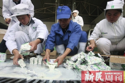《东方卫报》报道蒙牛毒牛奶事件的标题。蒙牛乳业新闻发言人卢建军说:“奶农饲料霉变是一个个别性问题,就像你家里面吃饭一样。不小心一个馒头发霉了,这是个别性问题。”