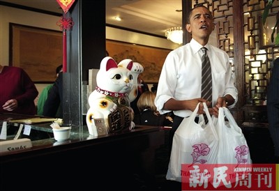 美国旧金山,奥巴马进入一家中餐馆,在饭店等候外卖打包,并与饭店员工和顾客握手合影。