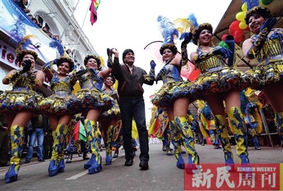 2月18日,玻利维亚Oruro,参加狂欢节的总统莫拉莱斯被美女环绕好不开心。