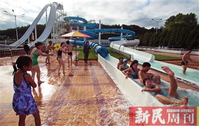 2012年9月8日,朝鲜平壤,人们在新建的水上乐园里玩水滑梯。