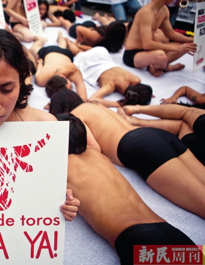 11月3日,秘鲁利马,抗议者赤裸上身“曝尸街头”,反对进行斗牛比赛。