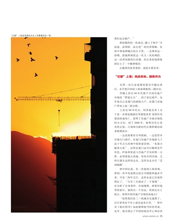 林中回忆说,有一次他到上海参观,看到一些开发商朋友的公司规模和他差不多,可是三四年之后,这些企业已经成倍增长了,“几年工夫就差了一个量级”。在分析了自身条件、市场规模、政策环境等因素后,他得出一个结论:得到北京上海去,得到中国房地产市场的高地去!