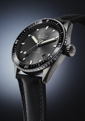 宝珀的五十噚Bathyscaphe潜水表, Blancpain宝珀采用了硅质游丝以加强机芯的精准度,透过蓝宝石水晶表背可将其风采尽收眼底。Blancpain宝珀的另一大创新之举则为液态金属(Liquidmetal®)深度计。这一非晶态金属合金可以防止任何形变,确保与陶瓷内圈的完美贴合。