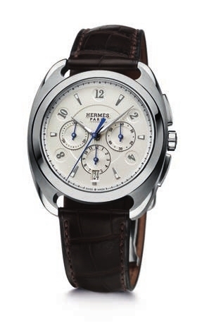 爱马仕的Dressage 计时秒表。 自2012年,所有Dressage表款皆搭载爱马仕自家研发机芯, 全新的Dressage计时码表贯彻优雅风格,备有两款型号:银白色表盘配哑面雪茄色鳄鱼皮表带,及黑色表盘配哑面黑色鳄鱼皮表带。