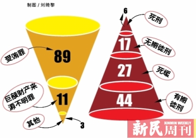 在35年的“打虎”史上,有6只“老虎”被处以极刑。 据田国良统计,103个遭查处的省部级官员案例中,从罪名来看,受贿罪居多,89例,其次是巨额财产来源不明罪,11例;从量刑来看,死刑6例,死缓27例,无期徒刑17例,有期徒刑44例。死刑、死缓和无期徒刑约占已判案例的53%。