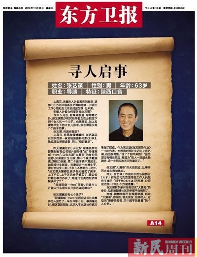 网友与媒体合力寻找张艺谋的“活动”日益升温,11月26日南京媒体《东方卫报》在其头版刊登“寻人启事”,寻找张艺谋。寻人启事第一排大字写着:“姓名:张艺谋。性别:男。年龄:63岁。职业:导演。特征:陕西口音。”