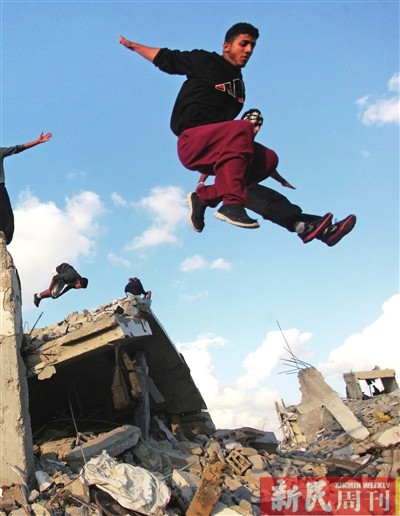 11月25日,南加沙汗尤尼斯,巴勒斯坦少年在废墟上练习跑酷,而就在几百米之外,以色列投下的炮弹引起巨大爆炸。