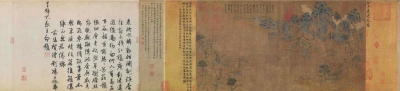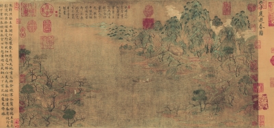 宋徽宗赵佶在前隔水处题有《展子虔游春图》。