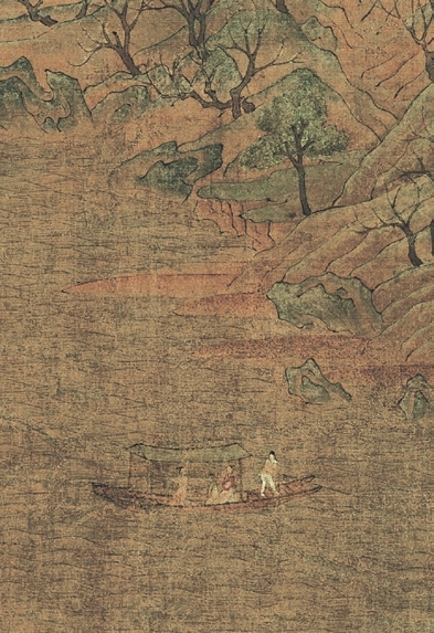 动景象:水的这边两个闲人在走媚的季节,到山间水旁游玩的生马,水的那边两个人在看水,湖中三位标致的女子,乘船闲话中,正在渡河。画面中,有一座溪上的小桥,山中还有古刹……
