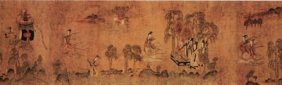 周文矩,句容(今属江苏)人,南唐画院翰林待诏。中主李璟时,他便以擅绘人物、车马、界画楼台以及宫廷贵族生活题材画而知名。史传他喜以瘦挺颤掣的笔法入画,以别具特色的画风称誉画坛。在这一点上,《文苑图卷》特别典型。全幅构图简约,表现唐代文人雅集活动的真实情景。图中人物的衣纹勾线曲折瘦挺,曲转顿挫,富于动感,准确地勾勒出人物的各种形体变化,体现了画家在人物画创作上以线塑形的深厚功底。