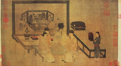 本幅原无作者款印,画面有宋徽宗题“韩滉文苑图”,因此一直被认为是韩滉之作。后据专家考证,此图实际是周文矩《琉