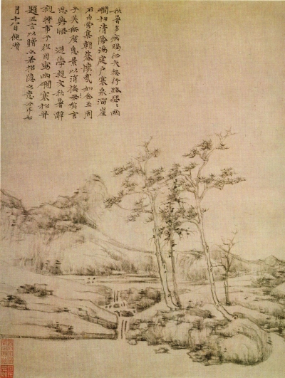 《幽涧寒松图》是倪氏山水的典型面貌。倪瓒运用其擅长的平远构图法,辅以干笔皴法及简括的笔意,将冬季疏林寒泉的萧瑟景象表现得淋漓尽致。可以说,倪瓒是影响后世最大的元代画家,他简约、疏淡的山水画风是明清大师们追逐的对象,如董其昌、石涛等巨匠均引其为鼻祖,石涛的书法题画,从精神到体式皆是以倪瓒为法的。倪瓒亦是一个以复古为旗帜,而追求艺术个性化的