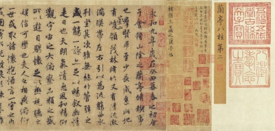 庄,充分体现了范仲淹作为政治家刚劲不阿、挺拔坚韧的品格。更难得的是,不同于一般的书法家,范仲淹留存于世的作品很少,此卷便更显珍贵。民国时,此卷流散出宫,几经周折之后,大藏家张伯驹先生从北京琉璃厂古玩商蕲伯生手中购得,视若珍宝。1956年,张伯驹先生高风亮节,以国为家,慷慨地将自己珍藏了几十年的八件书画,无偿捐给了文化部,最后全部归于故宫收藏,其中就包括这件《道服赞》。