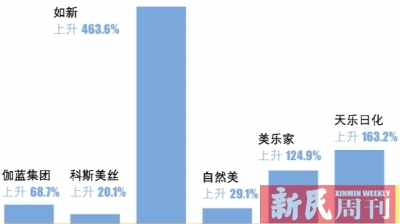 2016年的1月-4月,奉贤区已落户的健康美丽相关产业企业,经营业绩喜人。在产值上亿的各家企业中,伽蓝集团经营收入与去年同期相比上升68.7%,科斯美丝上升20.1%,如新上升436.6%,自然美上升29.1%,美乐家上升124.9%,天乐日化上升163.2%。