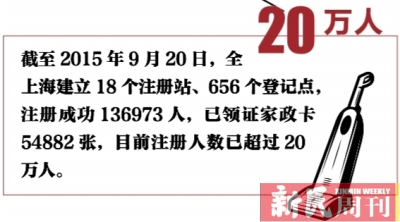 截至2015年9月20日,全上海建立18个注册站、656个登记点,注册成功136973人,已领证家政卡54882张,目前注册人数已超过20万人。
