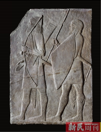约公元前700—前695年的“亚述浮雕”,刻画了两位国王近卫军士兵,是亚述帝国军事扩张的写照。这块浮雕曾经是亚述王西拿基立位于尼尼微的一处皇宫中的装饰。历史记载,亚述人都是骁勇善战的士兵,他们征服并控制了中东的大部分地区,缔造了当时最强大的帝国。军队中的士兵和护卫队成员来自帝国的各个地方。从着装上判断,浮雕中的男子可能是护卫队成员。左边的弓箭手可能是阿拉姆人(今属叙利亚),而长矛兵则来自黎凡特。