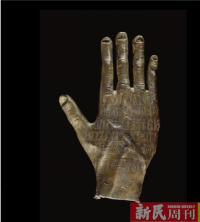 此外,也门出土的公元100—300年的“阿拉伯铜手”,作为信徒献给神灵的供品,反映了该地在前伊斯兰时代的本土宗教信仰。1700年前,世界各地的人们信奉着众多形形色色的神灵。随着伊斯兰教的到来,曾经遍布阿拉伯半岛的本土神明就消失殆尽了。这件青铜手是献给神灵塔拉布·里阳的供品。里阳是也门的一个山丘城镇,塔拉布是当地人民的守护神。一些不同寻常的细节——比如内凹的指甲和骨折过的小指,显示这只铜手可能是由真人的手翻模浇铸制成的。手上的铭文记录了一位名字也叫塔拉布的信徒向神献上这份供品,祈求好运。