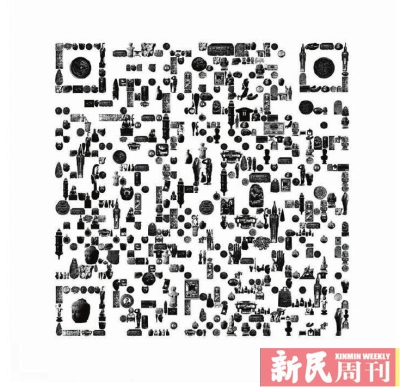 如今,这种二维码的应用不再局限于对货物的辨认和追踪,以及对证件、票据、运输的管理。当我们与新朋友在社交媒体平台上互加好友、扫码支付,或者使用一辆共享单车时,都会体验到它的便捷。二维码应用在中国极其普遍,已经成为我们生活中不可或缺的存在。不同于以往人类创造的有形物品,显示二维码的一方纸片或者屏幕是它唯一的物质形态。这些小小的方块包含无尽的信息,可以说是当下信息化时代的结晶。有趣的是,经过观众仔细观察,不难发现——上海博物馆的这方二维码也蕴藏了无尽的信息。事实上,它是由此次展示的100组展品图像组成的,其特殊意义也就不言而喻了。(本文图片由上海博物馆提供)