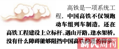 高铁是一项系统工程,中国高铁不仅领跑动车组列车制造,还在高铁工程建设上立标杆。遇山开路,逢水架桥,没有什么障碍能够阻挡中国高铁前进的脚步。从最热的海南岛,到最冷的哈尔滨,上下温差达七八十摄氏度,但中国高铁依然能安全平稳运行。