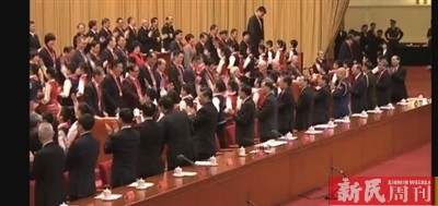 颁奖环节中,少先队员向受表彰人员献花,现场全体起立,热烈鼓掌。这时,习近平带领十九届中央政治局的同事们集体起身,转身向受表彰人员鼓掌祝贺。