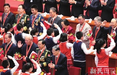 100名改革先锋、10名国际友人被郑重安排坐在了主席台。第一排是习近平和他的十九届中央政治局的同事们,第二排和第三排就是受表彰人员,其他领导人则坐在了最后一排。王沪宁宣读完党中央、国务院的表彰决定后,现场工作人员挨个念名单,每个受表彰人员都给了单独的镜头,110人,费时近20分钟。可谓备受尊崇。