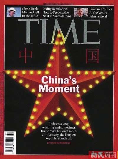 “中国时刻”跃然纸上,以鲜红的五角星作封面设计,美国媒体关注新中国成立60周年。