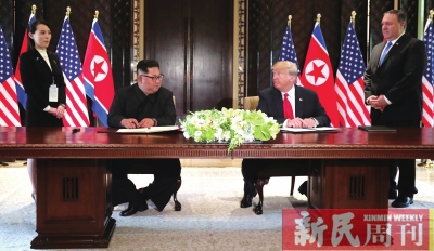 6.12,新加坡,朝美首脑会晤在嘉佩乐酒店举行,金正恩(左二)和特朗普(右二)出席签字仪式,双方签署此次朝美峰会历史性文件。