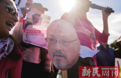 10.19,美国华盛顿特区,一名Codepink女性和平组织的示威者在白宫外拿着遇害沙特记者卡舒吉的照片。