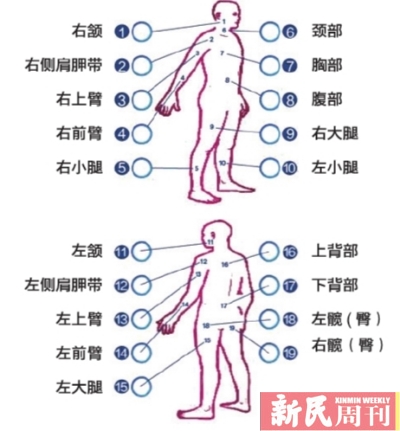 全身性疼痛,定义为5个区域中至少4个有疼痛,其中,颌、胸、腹部的疼痛不包括在全身疼痛范围;