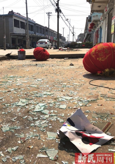 2. 爆炸点附近的居民街道,关闭的卷帘门在强大的外力冲击下,发生了变形,玻璃洒落一地。